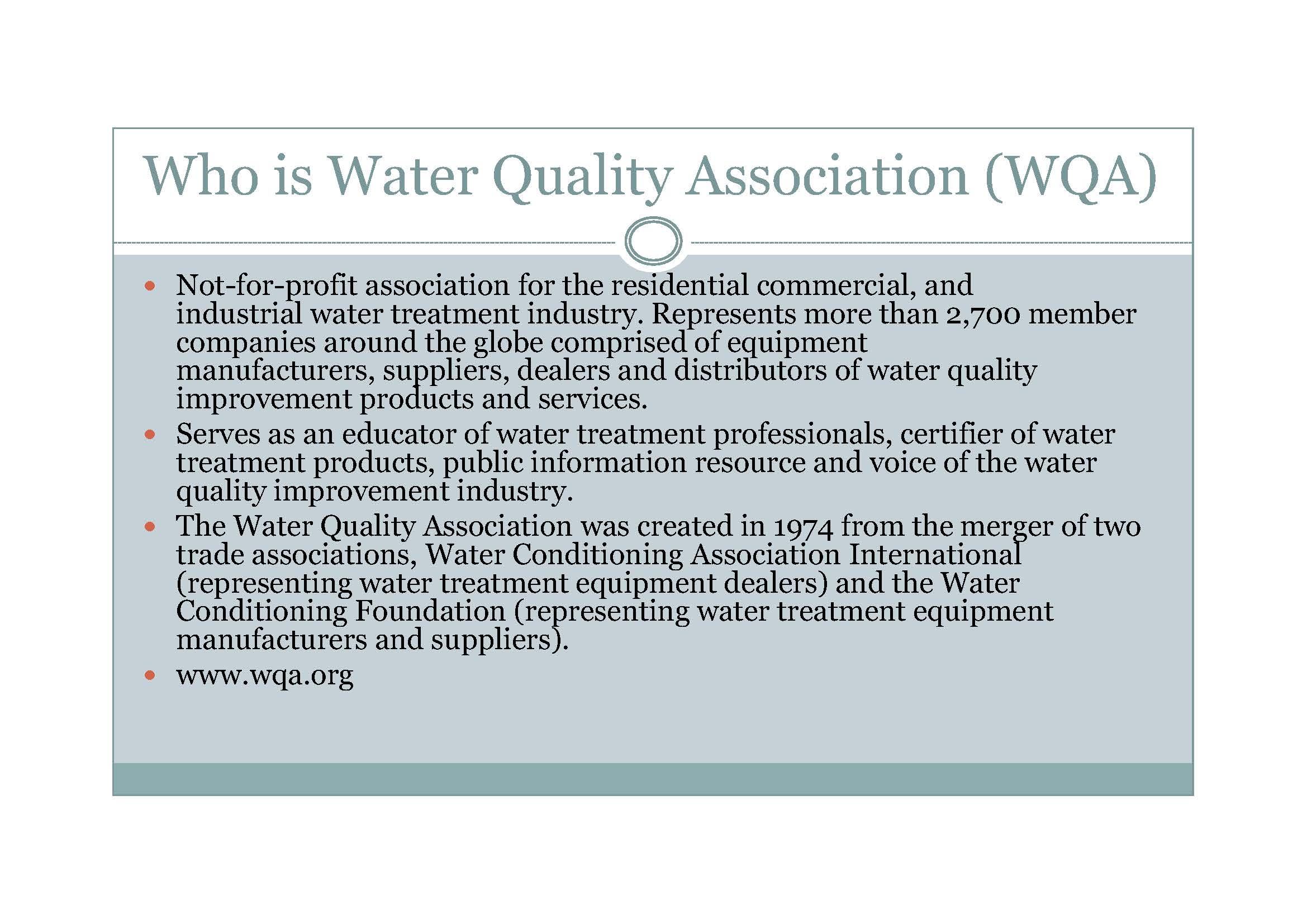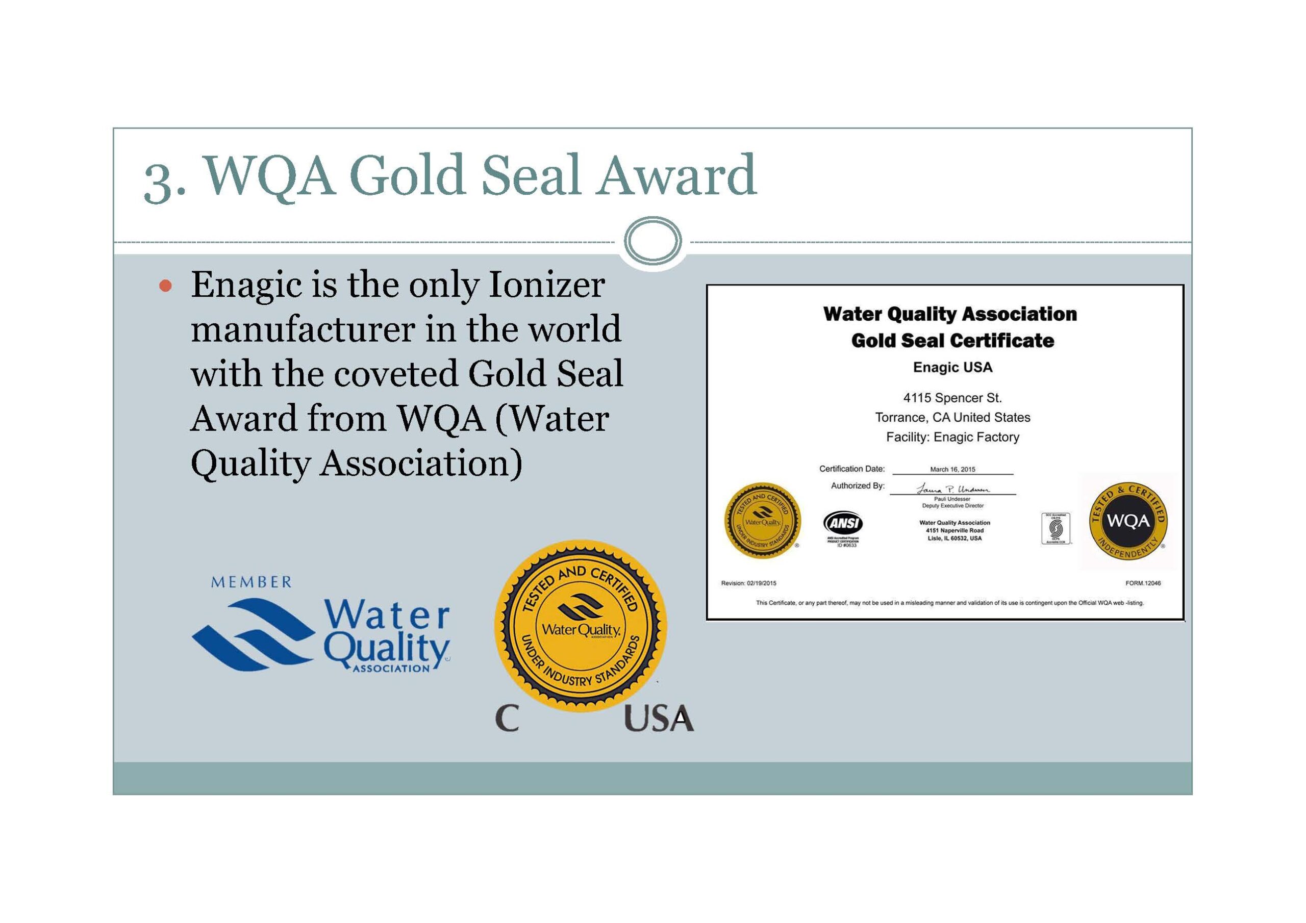 1- شهادة WQA: لمعرفة كل شيء عنها هذا موقعها: www.wqa.org وهي مؤسسة علمية طبية غير ربحية تهتم بجودة الماء من الناحية الصحية وغيرها، تأسست عام 1974م، وهدفها أن يتمكن الناس من الحصول على مياه عالية الجودة، ومن أحب منكم التدرب والتعلم معها فهذا موقعها التعليمي: www.wqa.org/education ، وعندها شهادة لا تعطيها إلاّ بشروط بالغة التعقيد، ولم يحصل عليها إلاّ النادر جداً؛ لذلك فإن شركة Enagic تفخر بحصولها على الشهادة الذهبية من هذه المؤسسة لدرجة أنها تضعها على وجه أشهر موديلاتها.